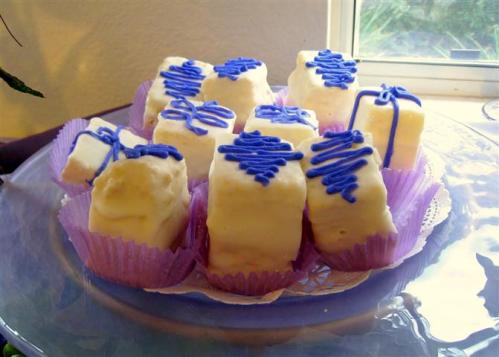 Optional: To decorate, use buttercream icing; keep it simple. Can use small paper cupcake holders to hold the petit four. Can keep out at room temperature for a couple of days. Need to refrigerate if longer, keeping in mind that chocolates will condensate in the refrigerator.