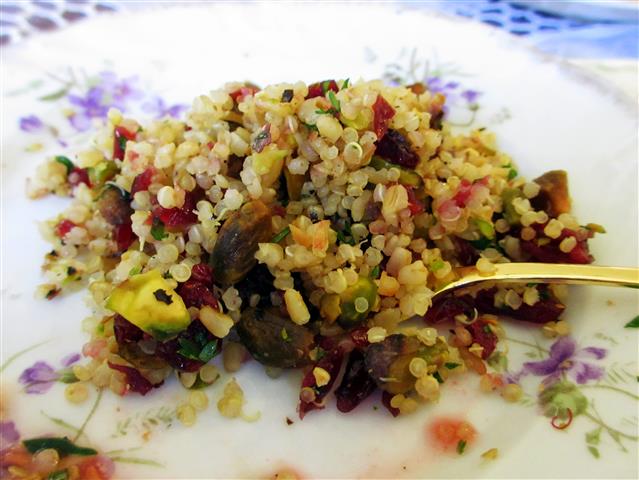- Combine remaining 2 tablespoons olive oil, lemon juice, and pepper in a large bowl; stir with a whisk. Add quinoa, cranberries, and remaining ingredients; toss gently to combine.