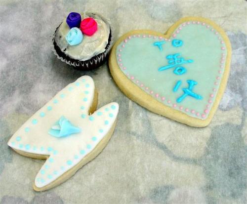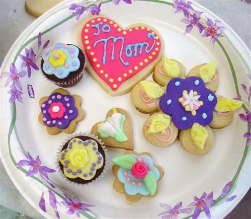 — *Fondant flowers can be cut out and shaped ahead of time. Use piped icing to adhere to decorated cookies.
